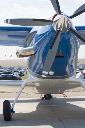 Chelyabinsk, Shagol village, Russia September 14, 2019: Close-up Russian blue military aircraft on the observation deck at the Aviation Day holiday, sunny day in autumn