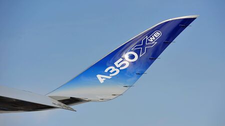 SINGAPORE - FEBRUARY 12: Raked winglet of the Airbus A350-900 XWB at Singapore Airshow February 12, 2014 in Singapore