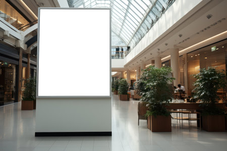 The image depicts a bustling shopping mall interior with multiple levels and various retail stores. Shoppers are seen walking and browsing through the mall. A prominent blank advertisement board is placed in the center, indicating available space for advertisements. The mall features modern architecture with a glass ceiling, allowing natural light to illuminate the area.