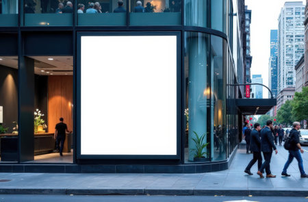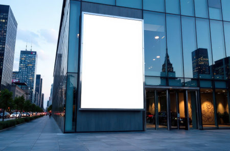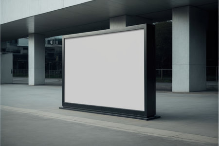Blank advertising billboard in a large-scale square size in front of office building. Concept of the media with empty screen. Finest generative AI.