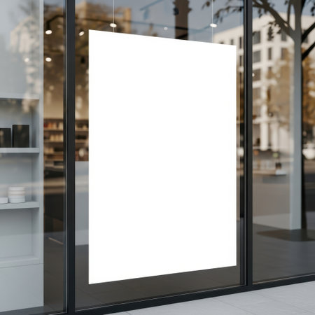 An empty poster frame on a modern pedestrian plaza, with sleek benches, public art installations, and people enjoying the space.
