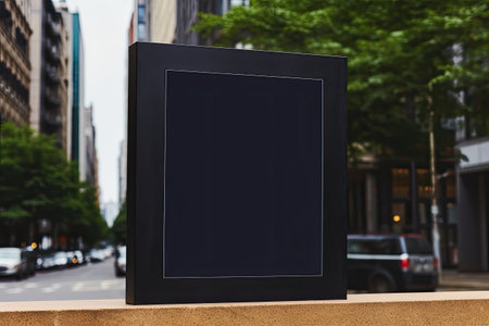 Blank black billboard on city street. Mock up, 3D Rendering, Black square signboard mockup outside of a building, AI Generated