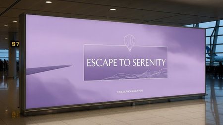 A large, illuminated digital billboard in an airport a soft lavender gradient background with subtle cloud-like textures. A minimalist outline of a hot air balloon is placed above a rectangular frame containing the text ESCAPE TO SERENITY in white, sans-serif letters. A portion of an airplane wing is visible on the left, and the tagline YOUR JOURNEY BEGINS HERE is subtly placed at the bottom.