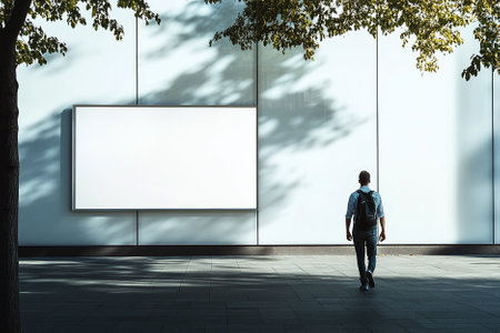 Rear view of a young man standing in front of a blank white poster on a wall in the city.