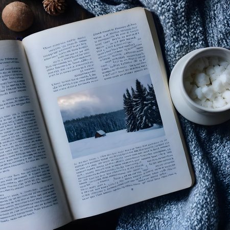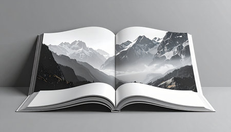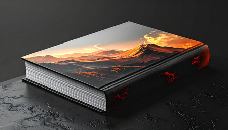 Mountain showing book with mountain landscape cover on textured dark surface keywords: book, cover, mountain,...