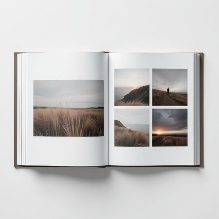 Open photo book displays serene landscape images, including grassy fields, silhouettes on hills, and dramatic skies. The pages contain five distinct photographs, no text visible
