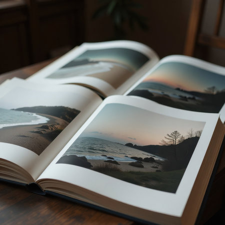 Open photo book on a wooden table displays four scenic landscape images, featuring beaches and coastal vistas with tranquil waters and soft, natural lighting at different times of day