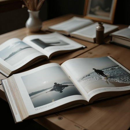 Open books on a wooden table display photographs of beach landscapes and lone figures. A vase with brushes and a small container are nearby, adding an artistic ambiance