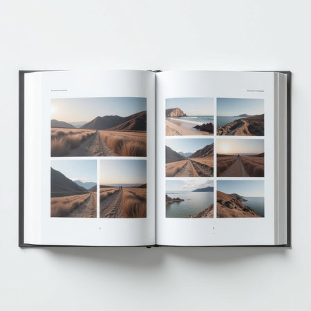 Open book displaying scenic landscape photos, featuring coastal and mountain views. Images are arranged in a grid format across two pages, showing nature and serene outdoor paths