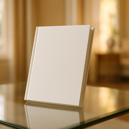 A minimalistic white book standing upright on a reflective table with blurred golden backdrop.