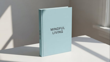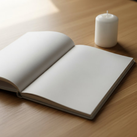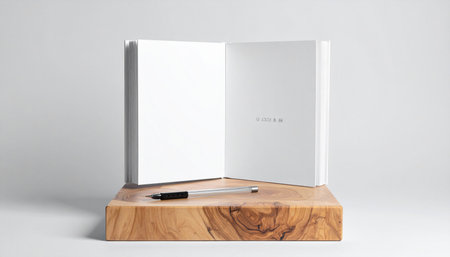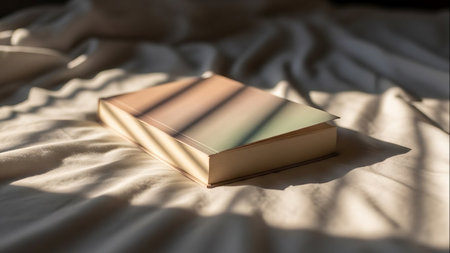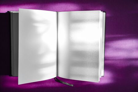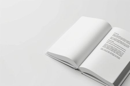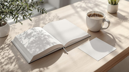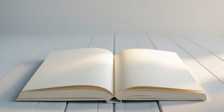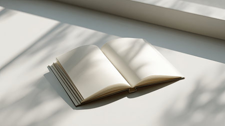A minimalist image of an open book with blank pages resting on a light surface, showcasing soft shadows and natural light for a serene vibe.