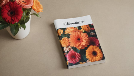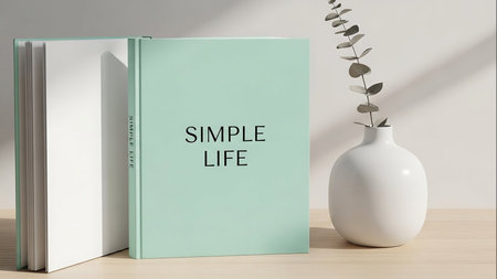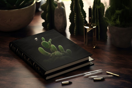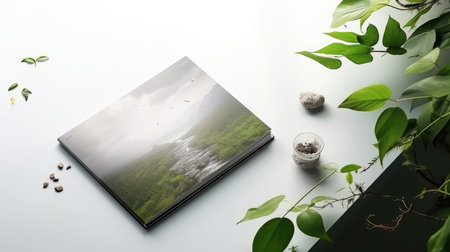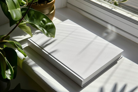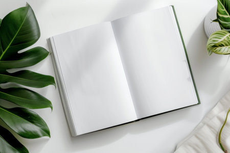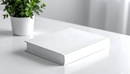 Blank book mockup on white table with plant in pot.