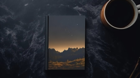 Black book with a picture of a mountain landscape and a cup of coffee