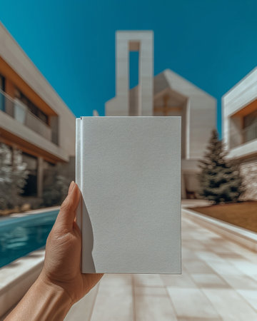 Hyper-realistic, close-up shot of hands holding an open book with one blank page, shallow depth-of-field, person reading/studying.