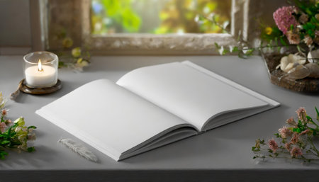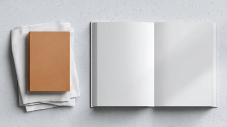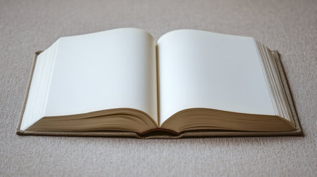 An open blank book rests on a soft surface, inviting creativity and ideas. Perfect for writing, sketching, or as a minimalist backdrop for design projects.