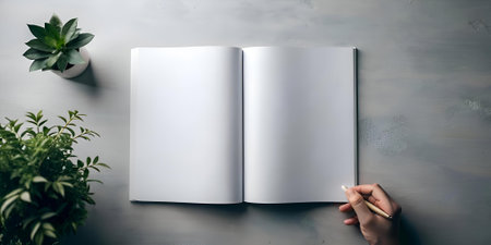 Blank magazine mockup with a hand holding a pen ready to write. Perfect for showcasing your designs and ideas!