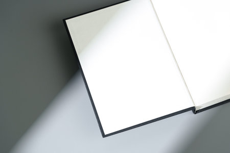 Blank open notepad on gray background studio shot