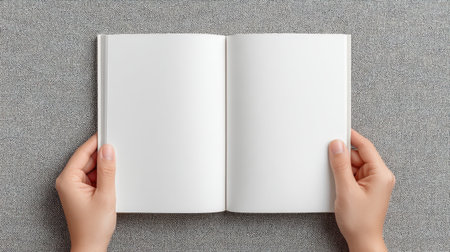 A visually appealing image showing an open blank book held by two hands against a textured gray background, perfect for creative projects, design mockups, and inspiration.