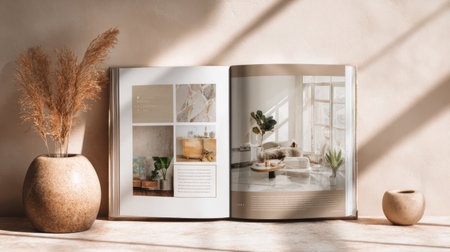 3D mockup of professional interior design portfolio template with structured layout, modern typography, soft natural lighting