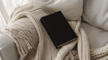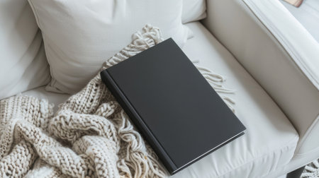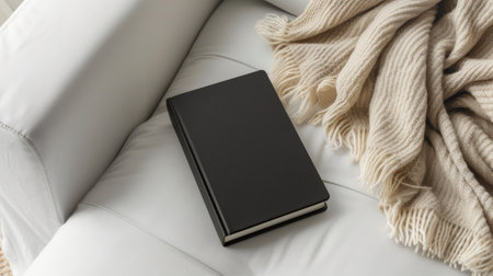 a closed slim B-format black softcover book placed prominently on a white chic sofa, accompanied by an oatmeal-colored wool blanket, creating a cozy and inviting atmosphere