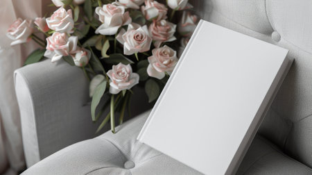 a white book with a blank cover mockup elegantly placed on a stylish chair, accompanied by a beautiful bouquet of roses