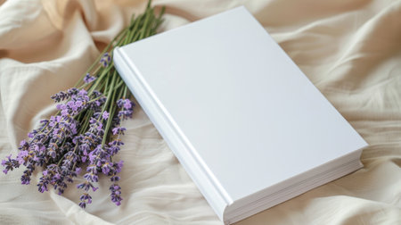 a white book mockup accompanied by a delicate bouquet of lavender, resting on a serene beige table