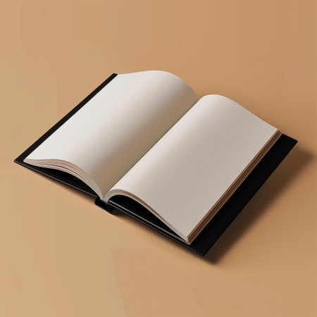 An open black book with blank white pages on a beige background