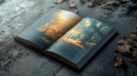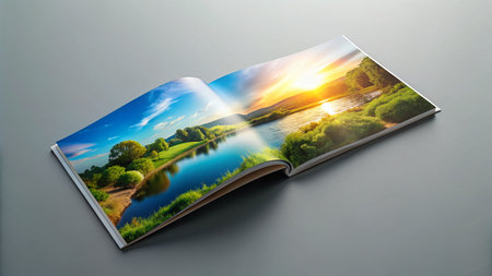 Opened book with lake and mountains in the background, 3d render