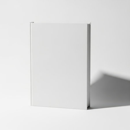 Minimal white hardcover book mockup standing vertically. Studio setup with solid background. Blank book cover. Design for invitation, postcard, banner, poster. High quality