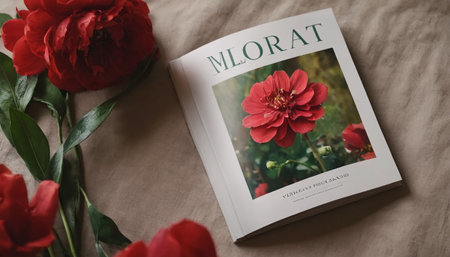 Blank magazine with red peony flowers on textile background, top view