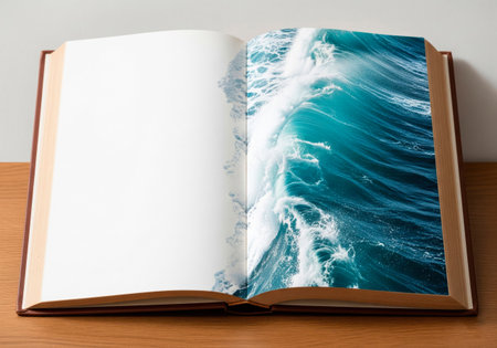 An open book with an ocean wave. Space for text