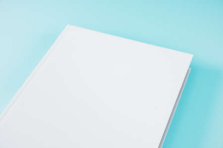 Creative closed white hardcover book on blue background. Publish and advertisement concept. Mock up, 3D Rendering