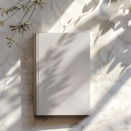 A blank white hardcover book mockup is placed on a marble surface, casting shadows from natural plant elements and sunlight.