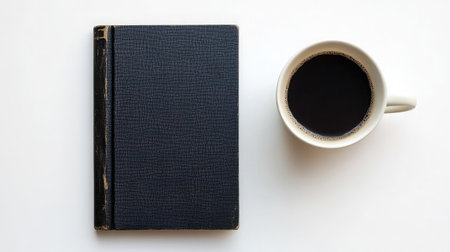 A hardcover book placed beside a cup of coffee on a white background.