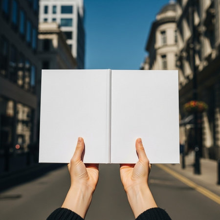 Female hands holding a blank book in front of a city street.