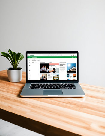 laptop with web site on screen on wooden table over grey background