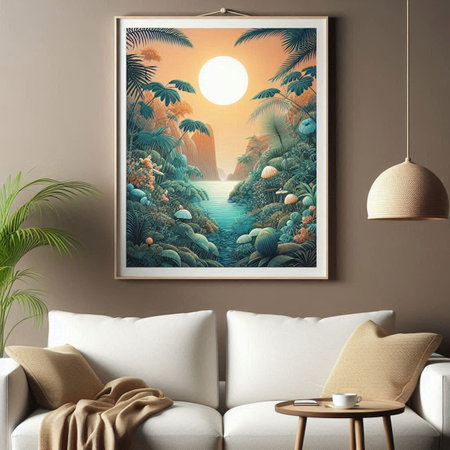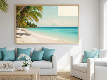 Elegant living room interior with tropical artwork and plants