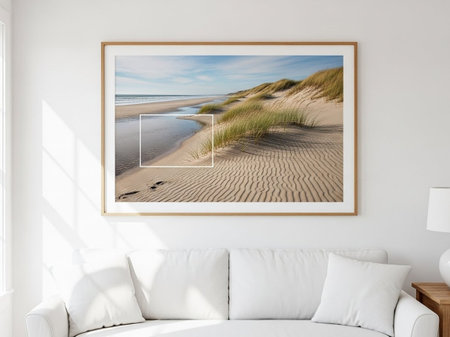 Beach room interior with white sofa, sand dunes and blank picture frame. 3d render