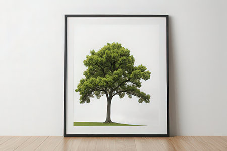 Green tree in a frame on a white wall. 3d rendering