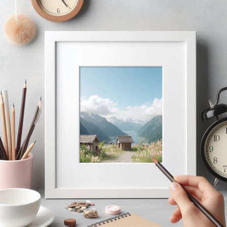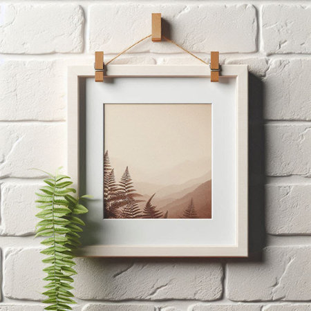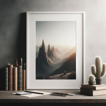 Photo frame mockup with a photo of mountains in the interior.
