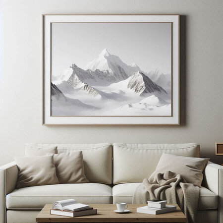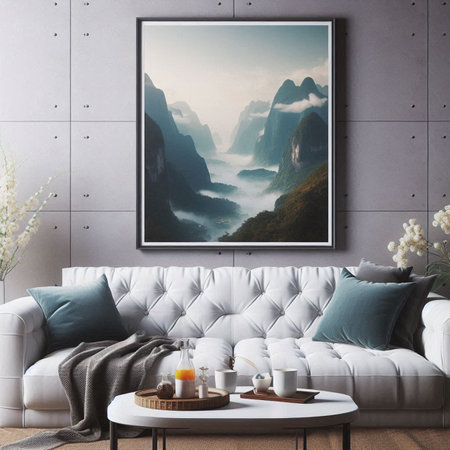 A contemporary living room with a framed photograph of a mountain sunset on a gray wall. The room is decorated with a beige sofa, a wooden coffee table, and two lamps. There is a plant on the floor and a window with a view of trees.