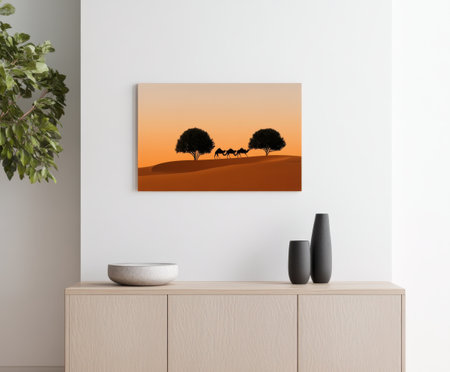 Desert silhouette artwork on minimalistic modern living room wall with camels and trees.