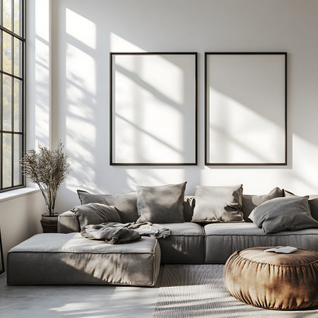 Scandinavian interior living room with mock up frame on the wall. Generative AI