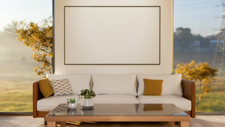 Blank frame on white wall between two glass doors of a living room with wooden table next to sofa and scenery outside. 3D rendering, 3D Illustration.