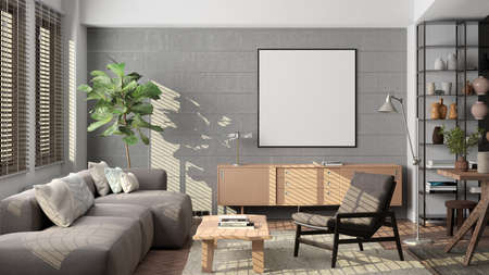 Square blank poster mockup on concrete wall in interior of living room. 3d illustration