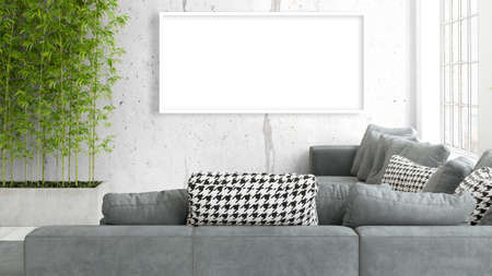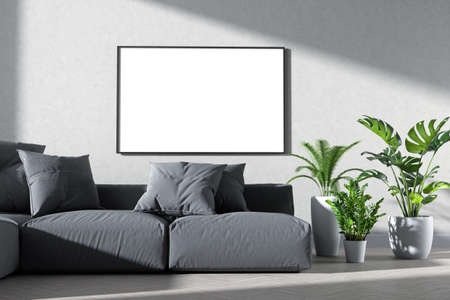 Interior of living room with grey sofa, plants and mock up poster. 3d render