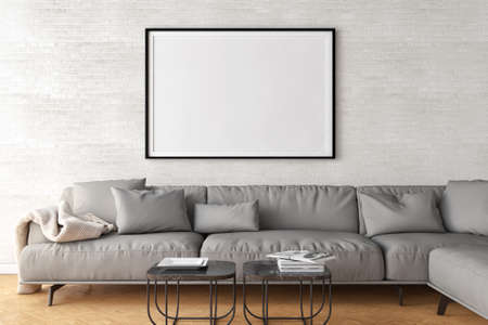 Interior of the living room with a beige sofa and a picture frame. 3d render