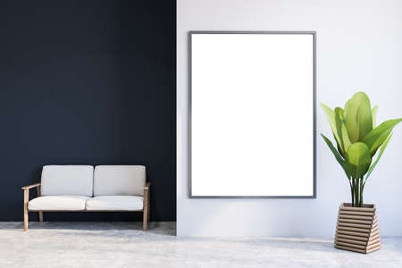 Interior of stylish living room with blue and white walls, concrete floor, white sofa and vertical mock up poster. 3d rendering