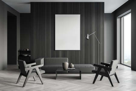 Interior of modern living room with gray walls, wooden floor, white sofa and mock up poster frame.