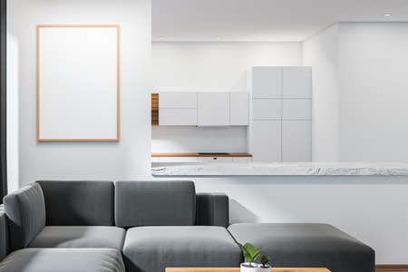 Modern living room interior with white framed poster on wall. Stylish kitchen. big gray couch. open space area. Mock up. 3d rendering.
